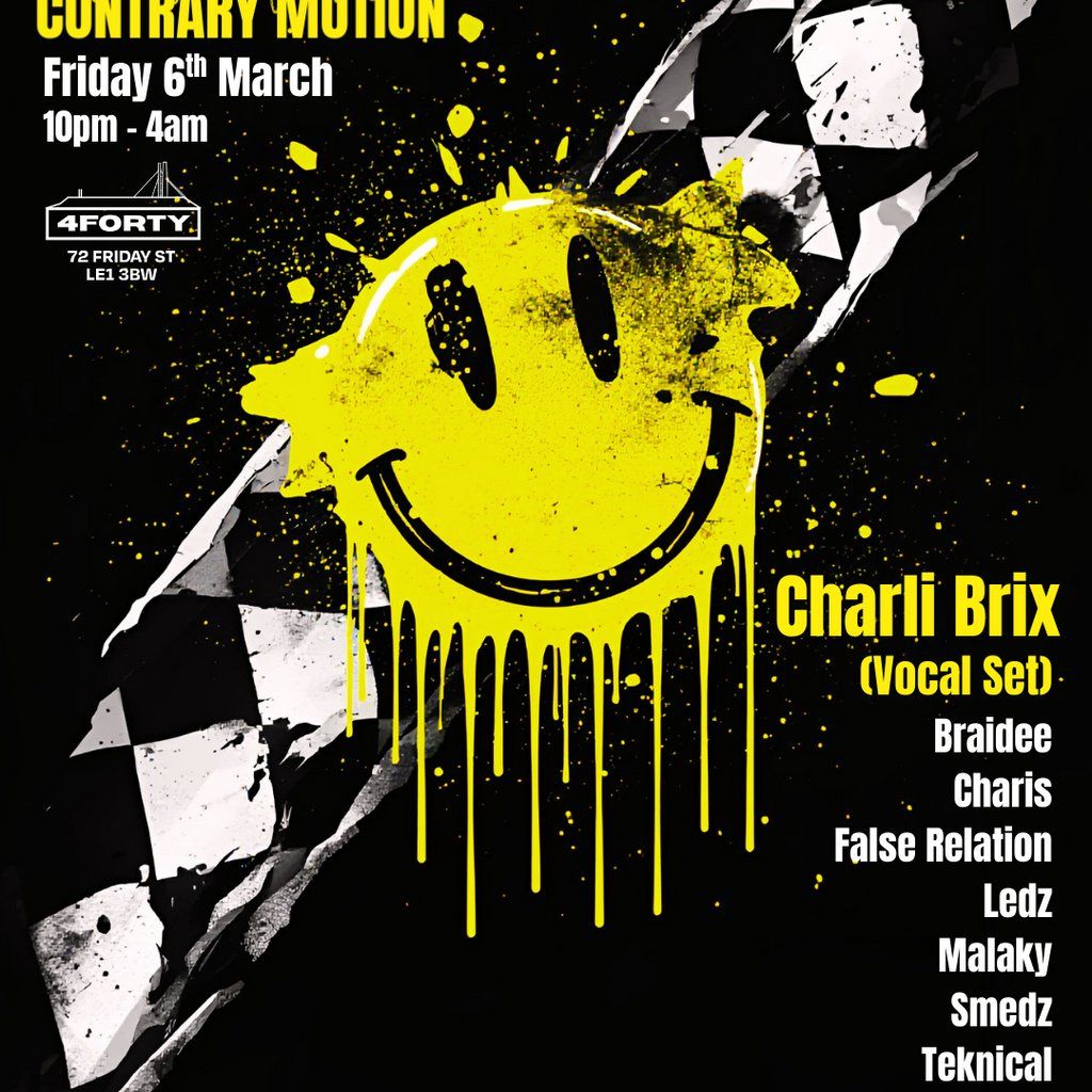 Charli Brix headlines Contrary Motion at 440, Leicester's newest underground venue, Friday 6th March 2026. Two stages of Drum & Bass and more.Artists