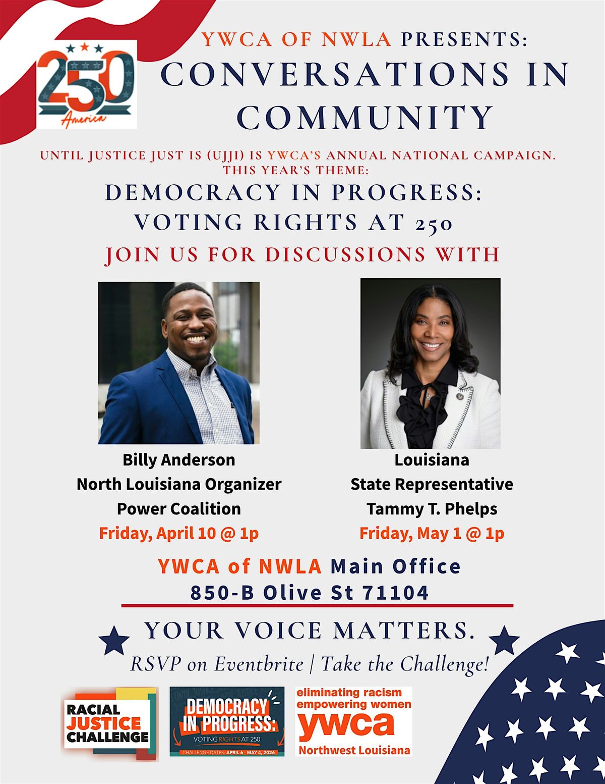 Billy Anderson, North Louisiana Organizer of Power Coalition will kick off the campaign Friday, April 10 at 1p discussing "The history and future of voting rights."