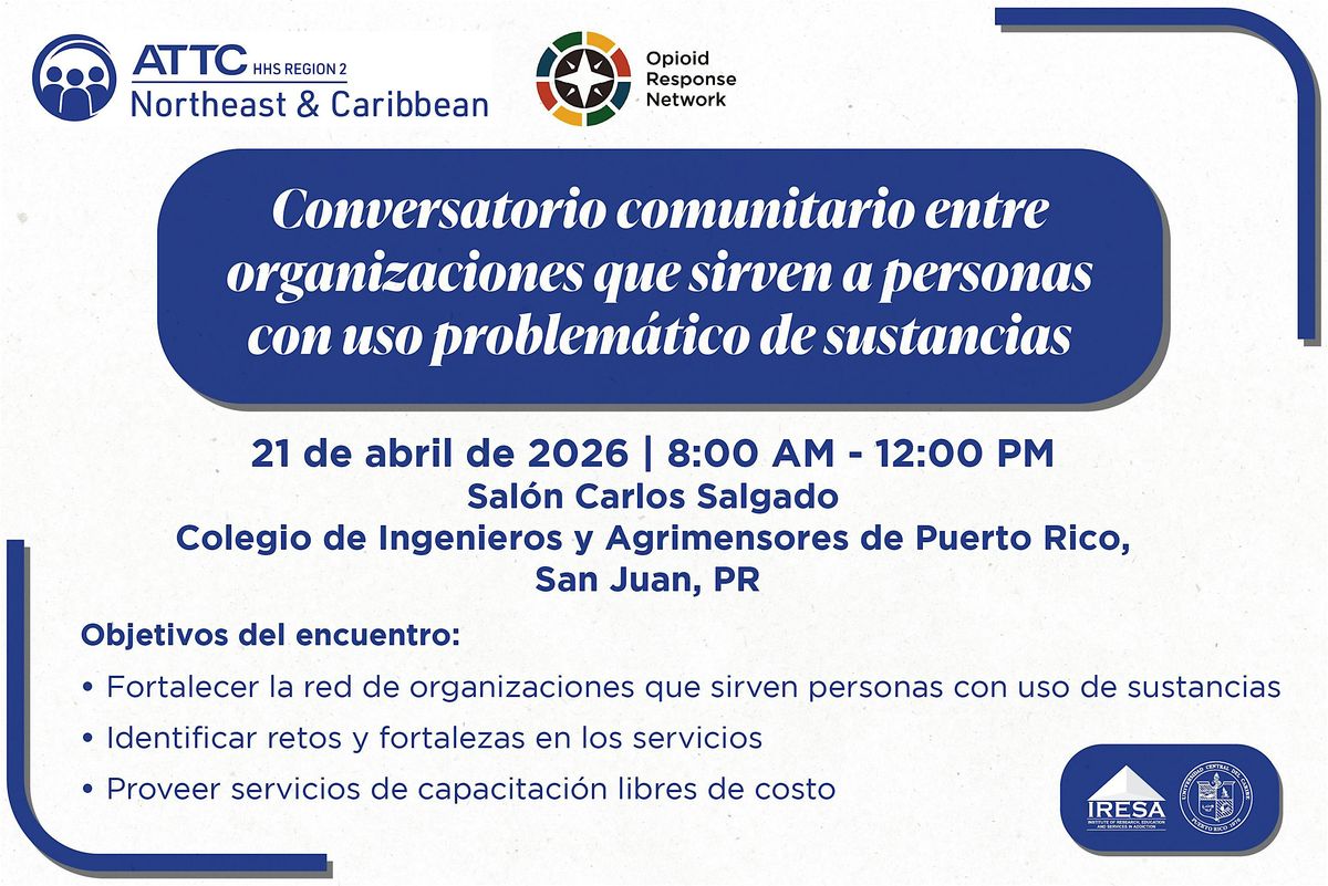 IRESA y sus proyectos del Northeast and Caribbean Addiction Technology Transfer Center (NeC ATTC) y el Opioid Response Network (ORN) les invitan a formar parte de este conversatorio comunitario entre organizaciones que ofrecen tratamiento a personas con uso problemático de sustancias.