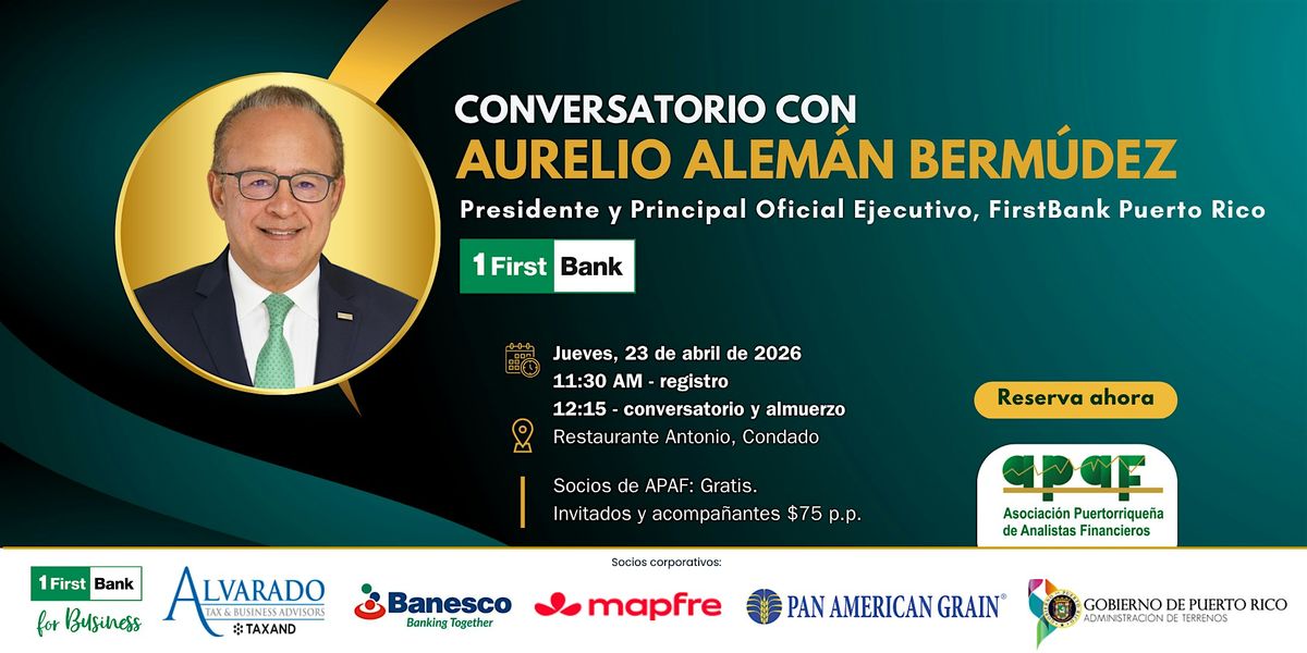 Les invitamos cordialmente a nuestro próximo almuerzo y conversatorio exclusivo, donde contaremos con la participación de Aurelio Alemán Bermúdez, Presidente y Principal Oficial Ejecutivo de First Bancorp y FirstBank Puerto Rico.