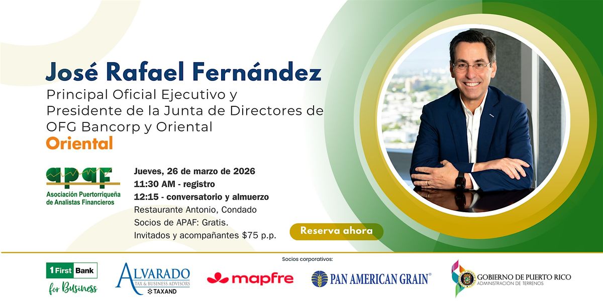 Les invitamos cordialmente a nuestro próximo almuerzo y conversatorio exclusivo, donde contaremos con la participación de José Rafael Fernández, Principal Oficial Ejecutivo y Presidente de la Junta de Directores de OFG Bancorp y Oriental.