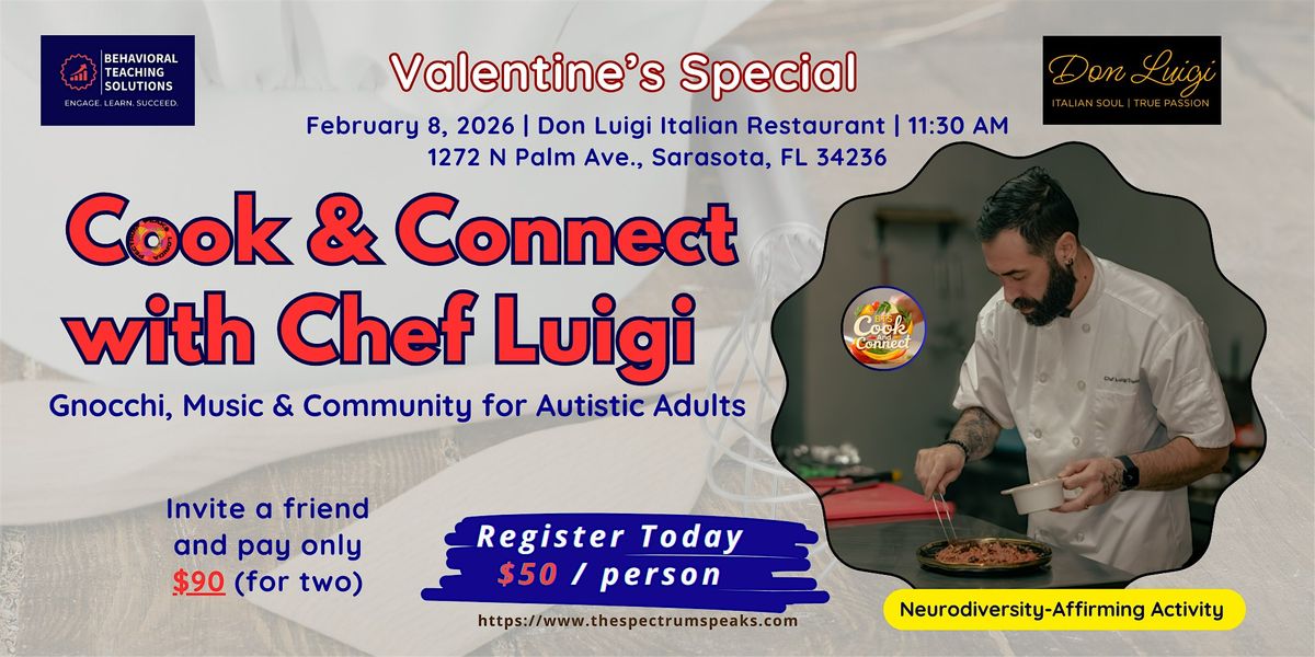 Celebrate Valentine’s with a cozy Sunday Cook & Connect special designed for autistic and neurodivergent adults who want a relaxed space to meet new people. Join Chef Luigi in our life-skills kitchen as he guides you through making fresh, handmade gnocchi, simple, hands-on, and sensory-friendly.