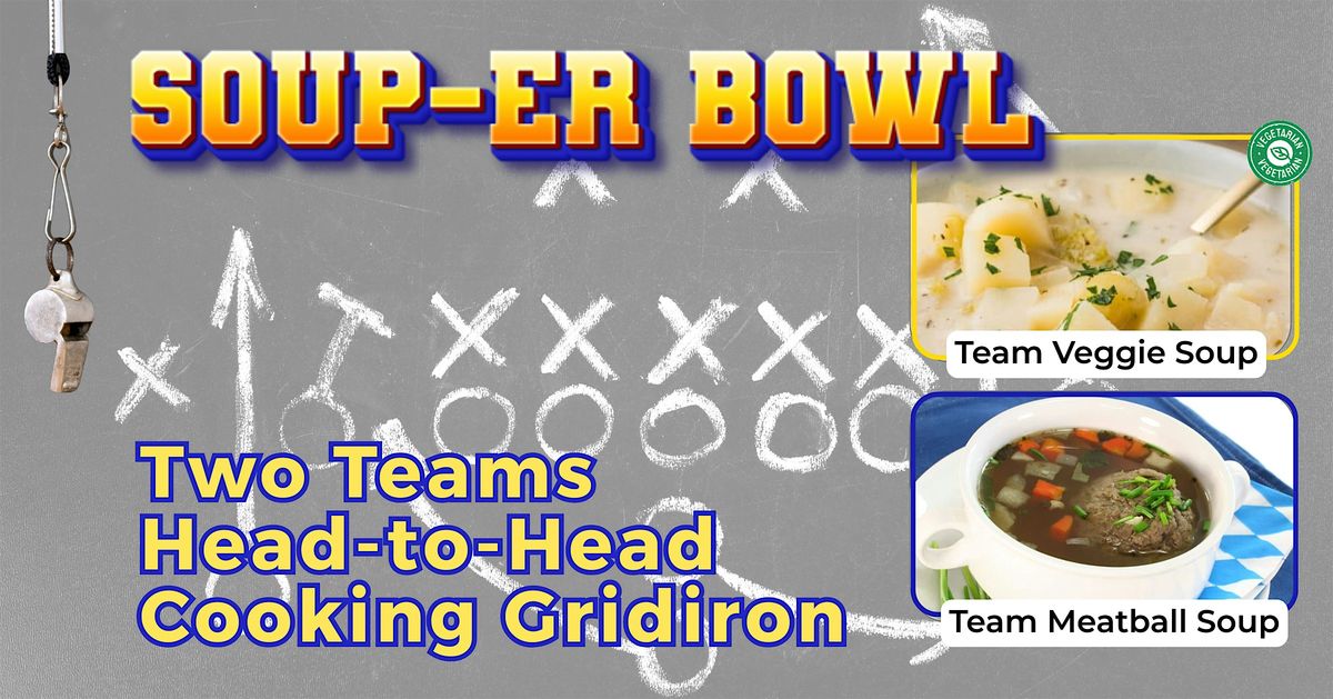 This hands-on, beginner-friendly cooking experience will show you how - using traditional recipes that are easy to master. Join your team: Team Veggie | Team Meatball. You will create a soup and then enter the cooking gridiron. Best soup wins bragging rights. Then everyone joins together for a soup-er bowl dinner.