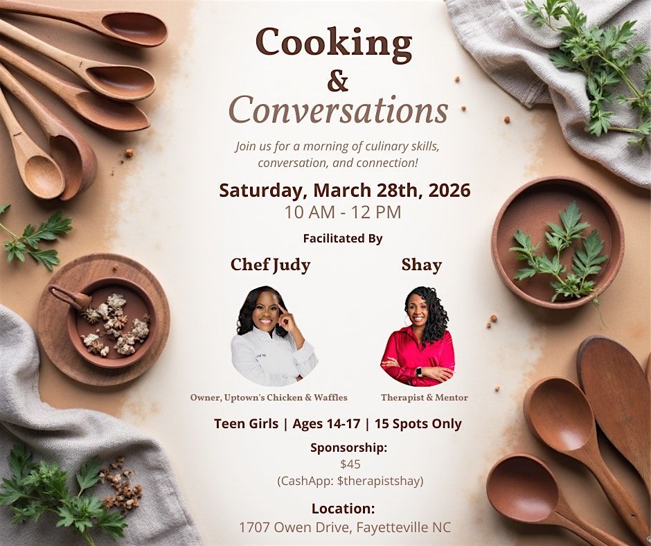 Led by Chef Judy, owner of Uptown’s Chicken & Waffles, and Shay, therapist and mentor, this event blends hands-on cooking with guided discussions that encourage connection, self-expression, and community among young women.