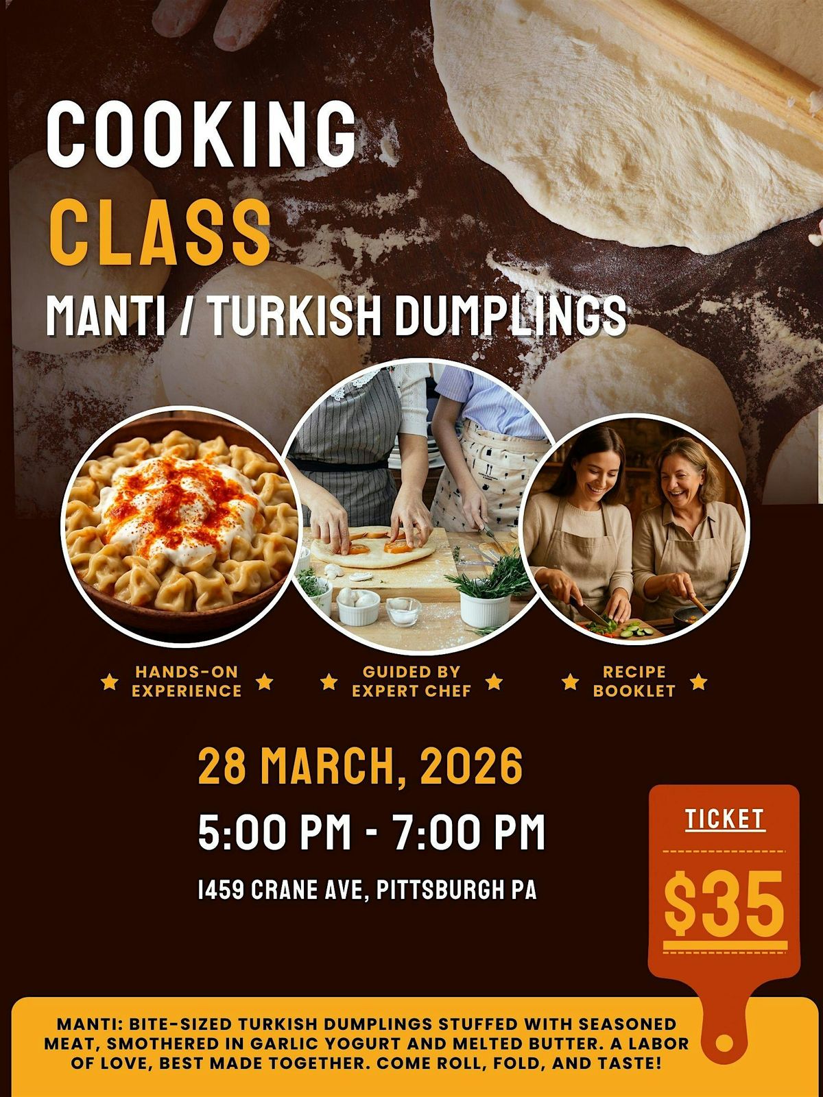 Love diving into new flavors? Come in person and get hands-on making delicious manti, those tiny Turkish dumplings packed with yum. It's all about mixing, folding, and sharing the love—and the food! Perfect for foodies or anyone curious about cooking Turkish favorites. Bring your appetite and let's roll up our sleeves together!