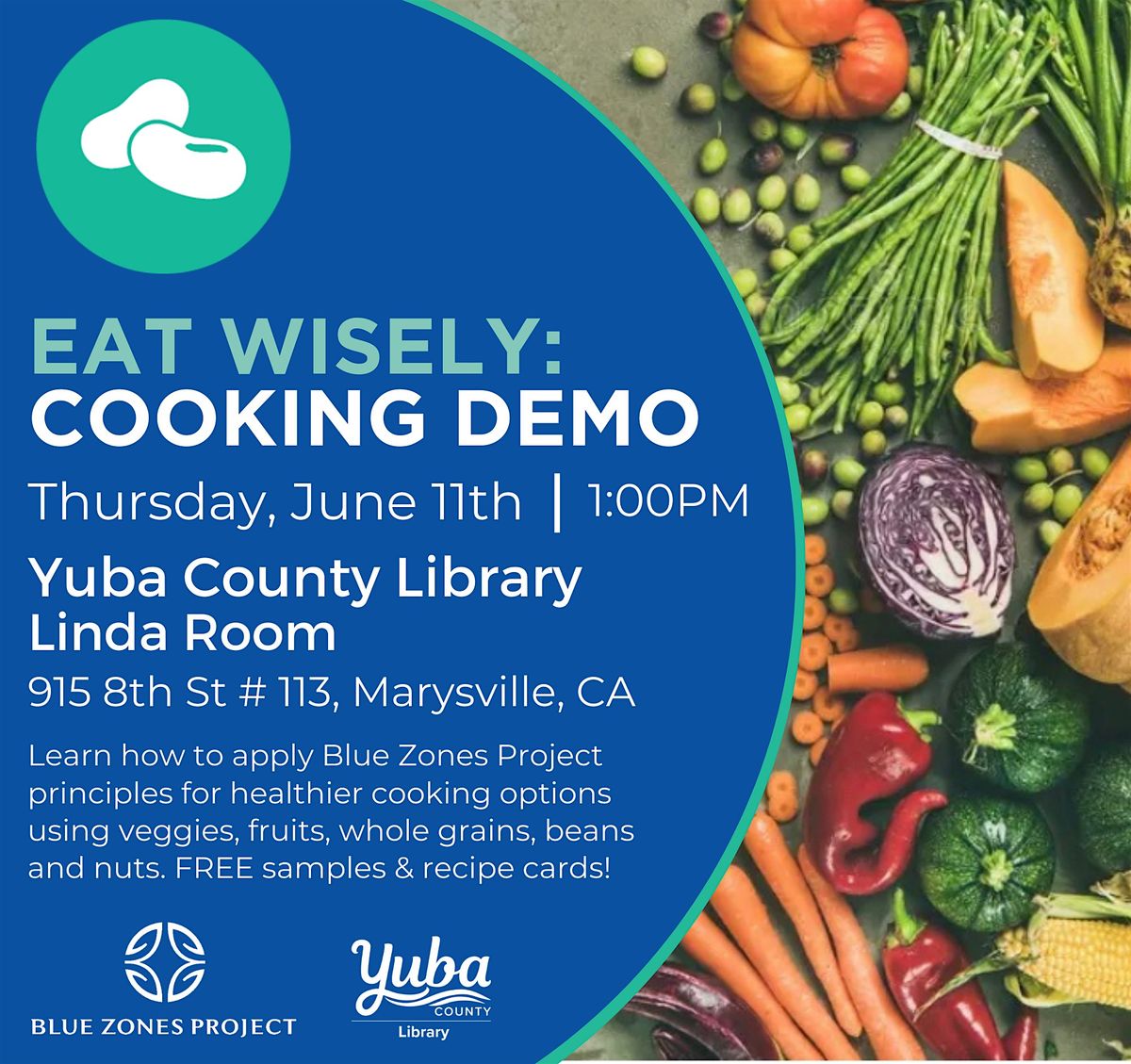 Learn how to apply Blue Zones Project principles for healthier cooking options using veggies, fruits, whole grains, beans and nuts at the Yuba County Library, in the Linda Room!