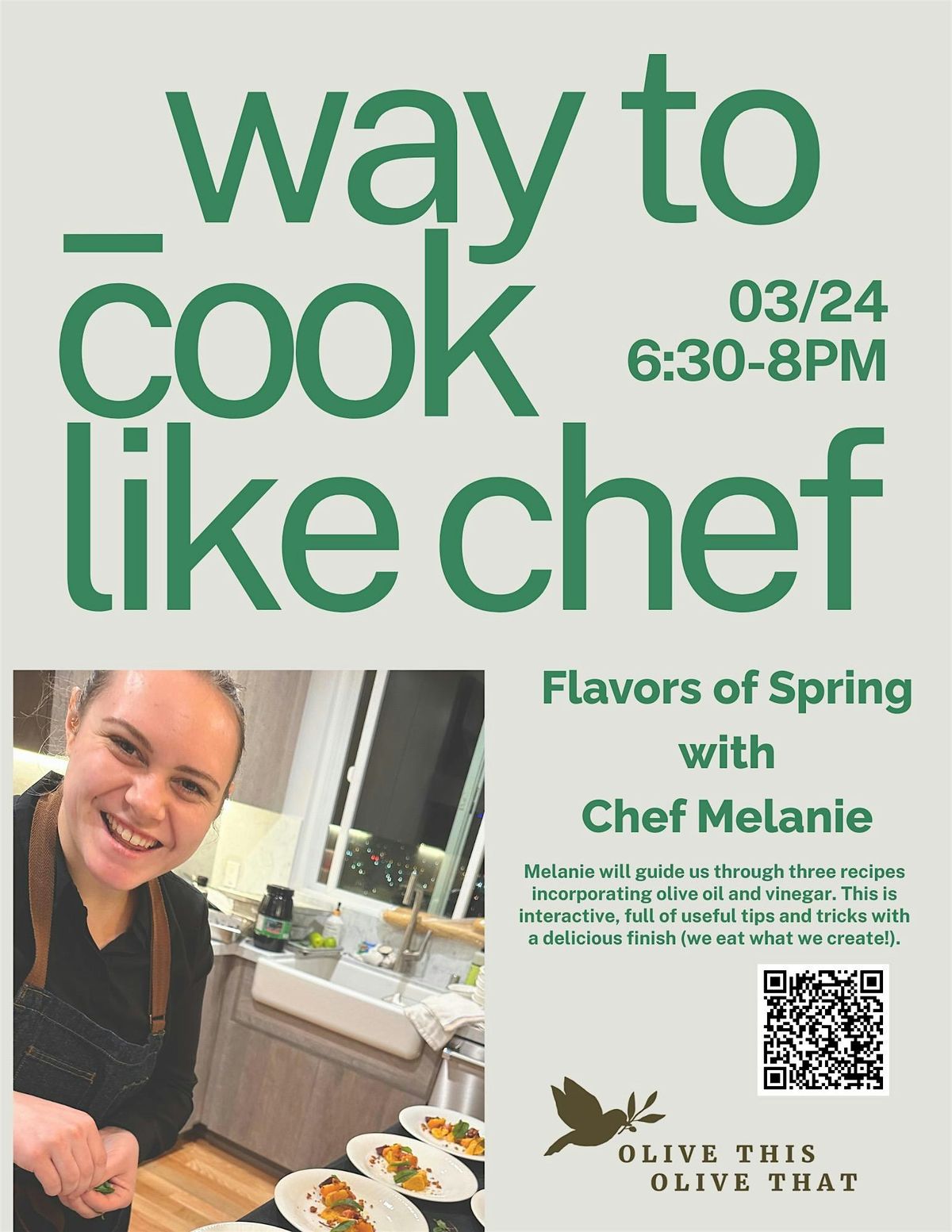 Chef Melanie grew up cooking with Grandma for the family, themed holiday events, and the garden club lunch (for 150). She is an olive oil and vinegar pairing professional who loves to create simple, delicious meals. This is an interactive event. Melanie will guide us through three recipes and pepper with kitchen tips and tricks. Food and beverage included.