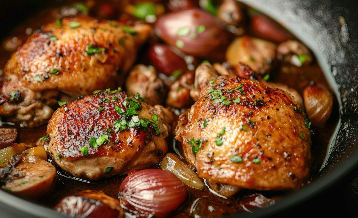 - Coq au Vin: Chicken simmered in red wine sauce with crispy bacon, and mushroom.