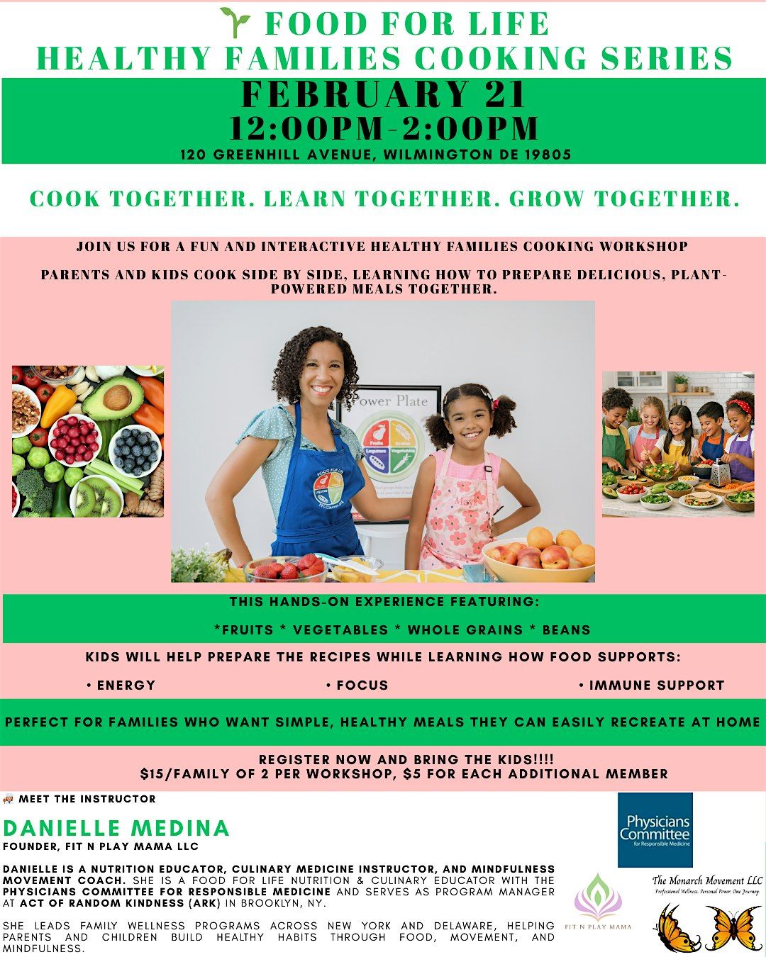 This hands-on experience is plant-predominant, featuring fruits, vegetables, whole grains, and beans made tasty and exciting for the whole family. Kids will help prepare the recipes while learning how food supports: