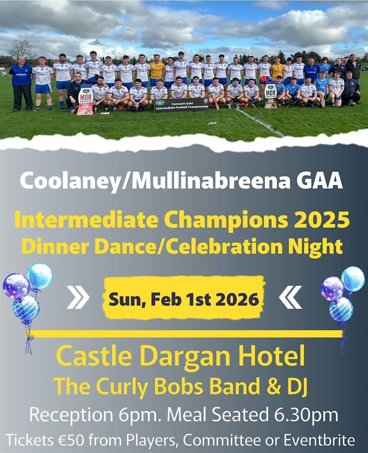 Coolaney/Mullinabreena GAA are delighted to invite members, supporters and friends to our Intermediate Champions 2025 Dinner Dance & Celebration Night. Sunday, 1st February 2026, Castle Dargan Hotel Reception at 6.00pm | Meal seated 6.30pm. Music on the night by The Curly Bobs Band & DJ. The highlight of the night will see our Intermediate County Champions of 2025 presented with their medals, as we celebrate a historic season in blue and white.