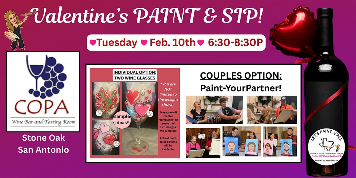 Choose from painting TWO wine glasses, -OR- bring your significant other for a romantic date night full of laughs while we paint each other on canvases!