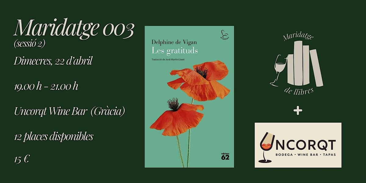 En aquesta tercera edició del nostre club de lectura maridarem el llibre "Les Gratituds" de Delphine de Vigan amb una selecció de vins escollit per Uncorqt Wine Bar i un petit pica pica.