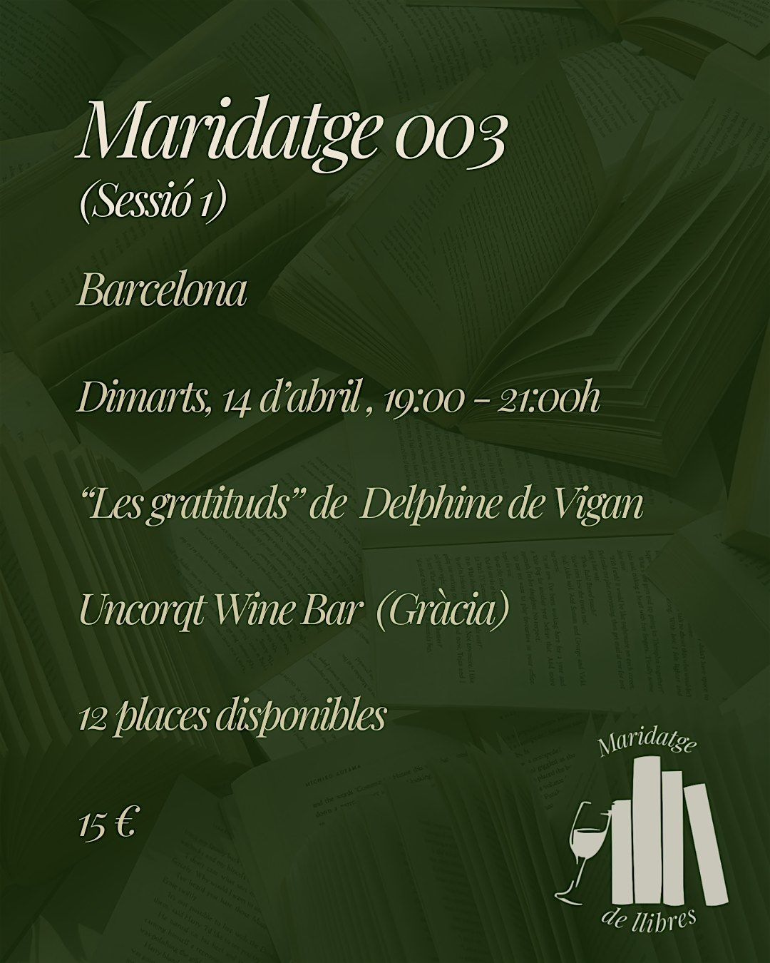 En aquesta tercera edició del nostre club de lectura maridarem el llibre "Les Gratituds" de Delphine de Vigan amb una selecció de vins escollit per Uncorqt Wine Bar i un petit pica pica.