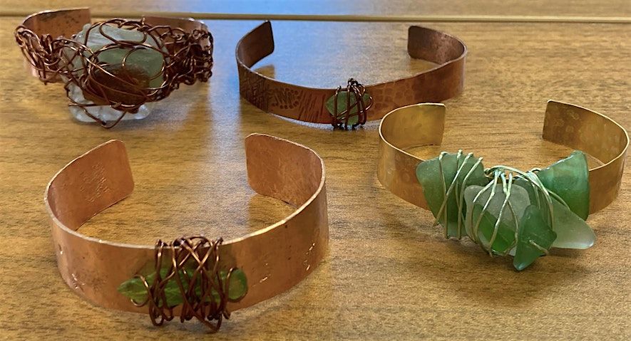 Join us and create a pretty copper cuff bracelet with sea glass and colored wire. In this class you will learn to use a jeweler’s saw and files to shape the edges of your copper strip. Then you can add texture to the surface with stamps and hammers. Finally, you will use colored wire and sea glass to embellish your masterpiece. Bring your own sea glass, or use some of ours. This class is relaxed and fun. Copper is known to have good benefits and healing qualities. All materials are included. Please bring reading glasses, if needed.