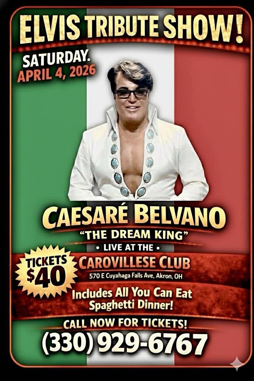 ---------------------------------------------------------------------------He is The Dream King. Caesare Belvano is an American actor, singer, lookalike, and singing tribute actor to Legendary Elvis Presley.Caesare is regarded as the โUltimate Elvis Tribute Artist.The Sun Never Sets On A Legend!Dinner from 5-6:30 | Elvis from 7-9 | Meet & Greet 9-10$40 a Person gets you: