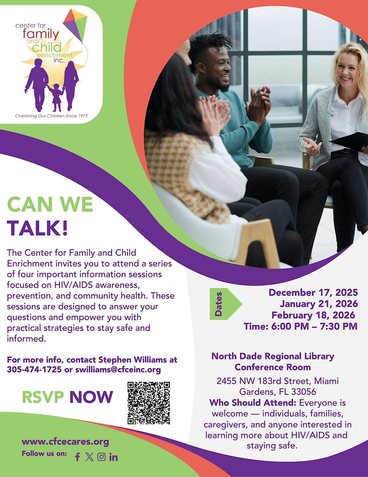 Join The Center for Family and Child Enrichment (CFCE) for an empowering four-part community conversation series focused on HIV/AIDS awareness, prevention, and overall community health. These sessions are designed to provide clear, practical information to help individuals, families, and caregivers stay safe, informed, and supported.