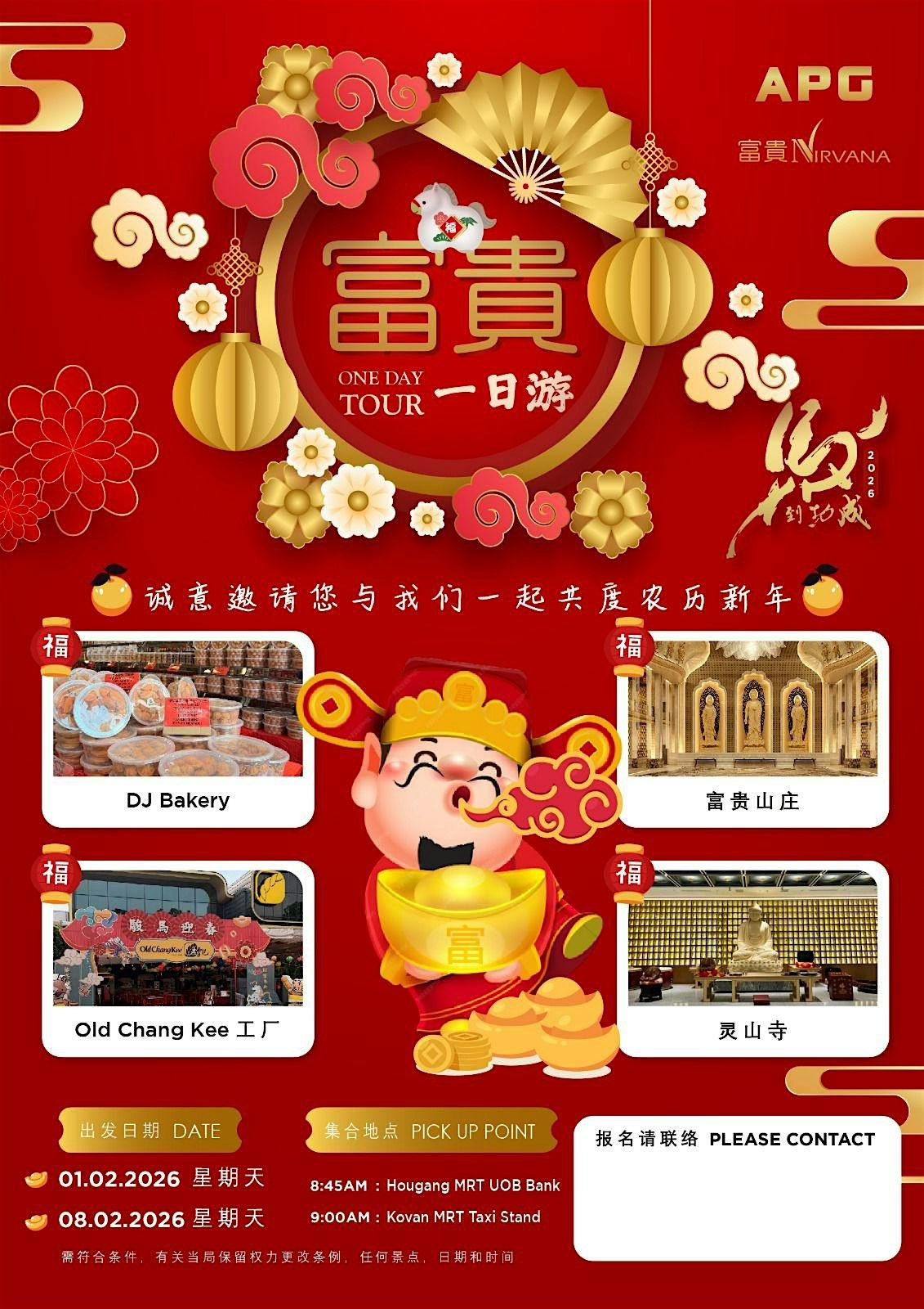 Join us for a meaningful and joy-filled day as 富贵 Nirvana, an APG Authorized Agency, warmly invites you to celebrate the Lunar New Year together. This exclusive one-day tour blends tradition, community, and festive fun—all in one unforgettable experience.