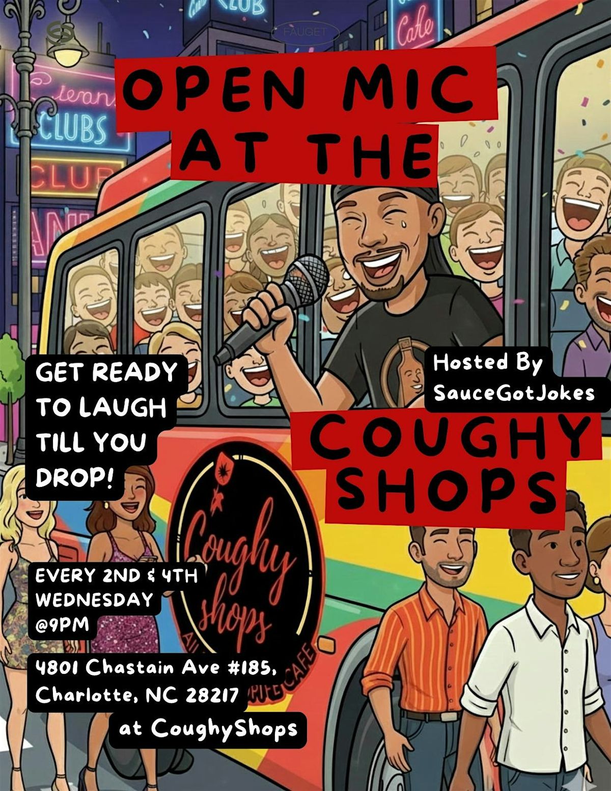 Get ready for a night of non-stop comedy! Join host SauceGotJokes at Coughy Shops for Charlotte’s newest open mic.