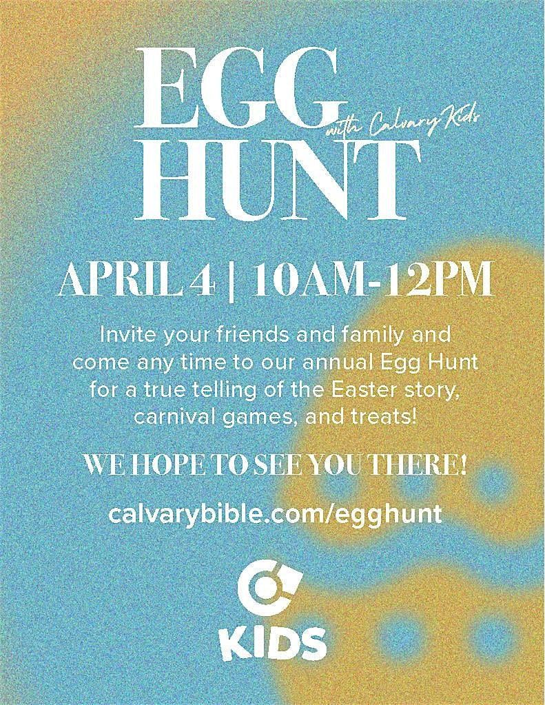 Easter Egg Hunt - April 4, 2026. 10am-12pmBring your baskets and join us at Calvary anytime between 10am-12pm for a unique Easter Egg Hunt!