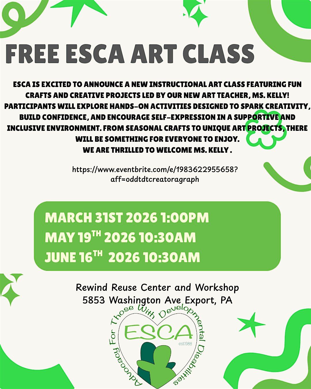 ESCA is excited to announce a new instructional art class featuring fun crafts and creative projects led by our new art teacher Ms. Kelly.About this Event