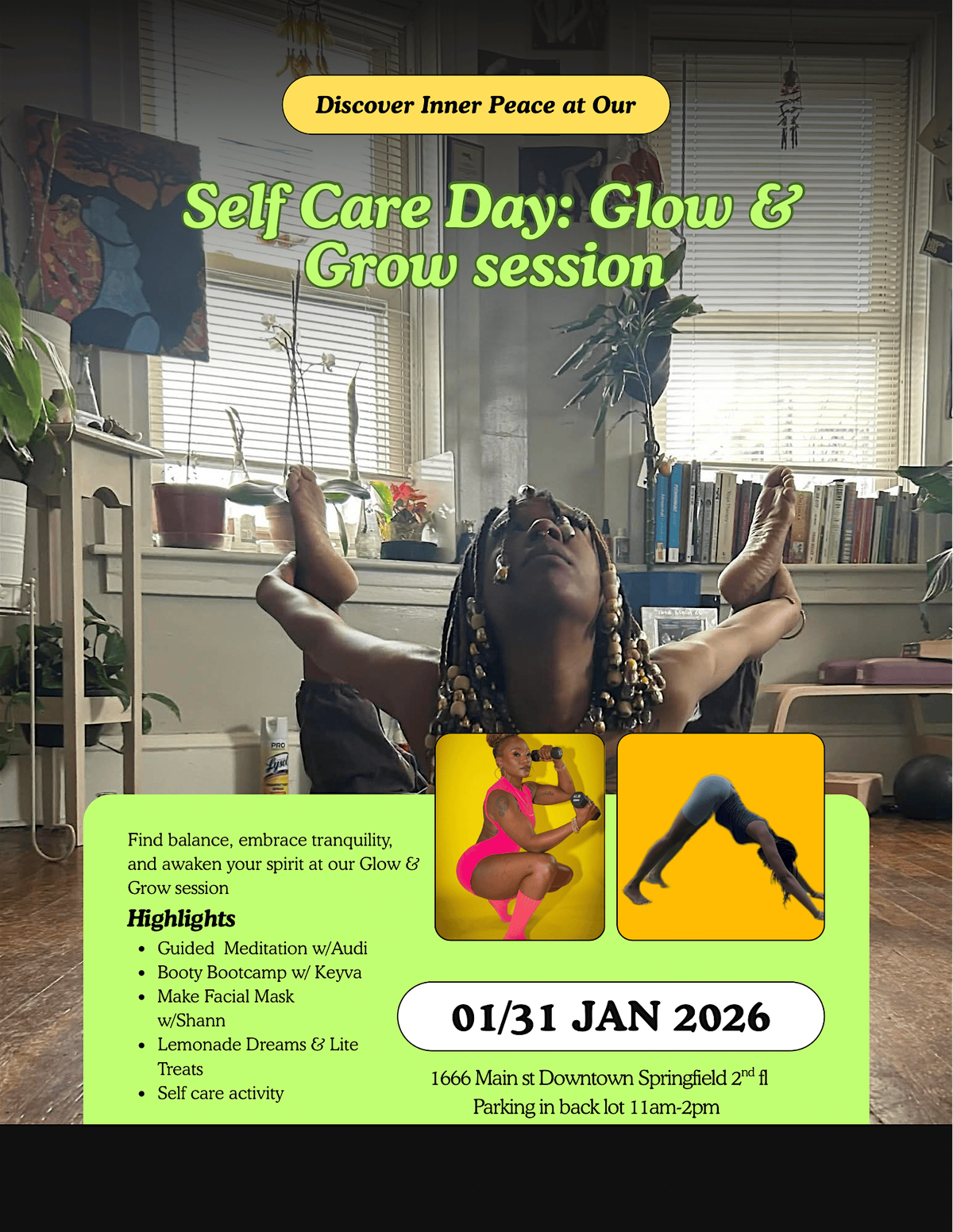 Come for a day of free self care with some yoga , make your own lip scrub , booty bootcamp and a self care reflection activityAgenda