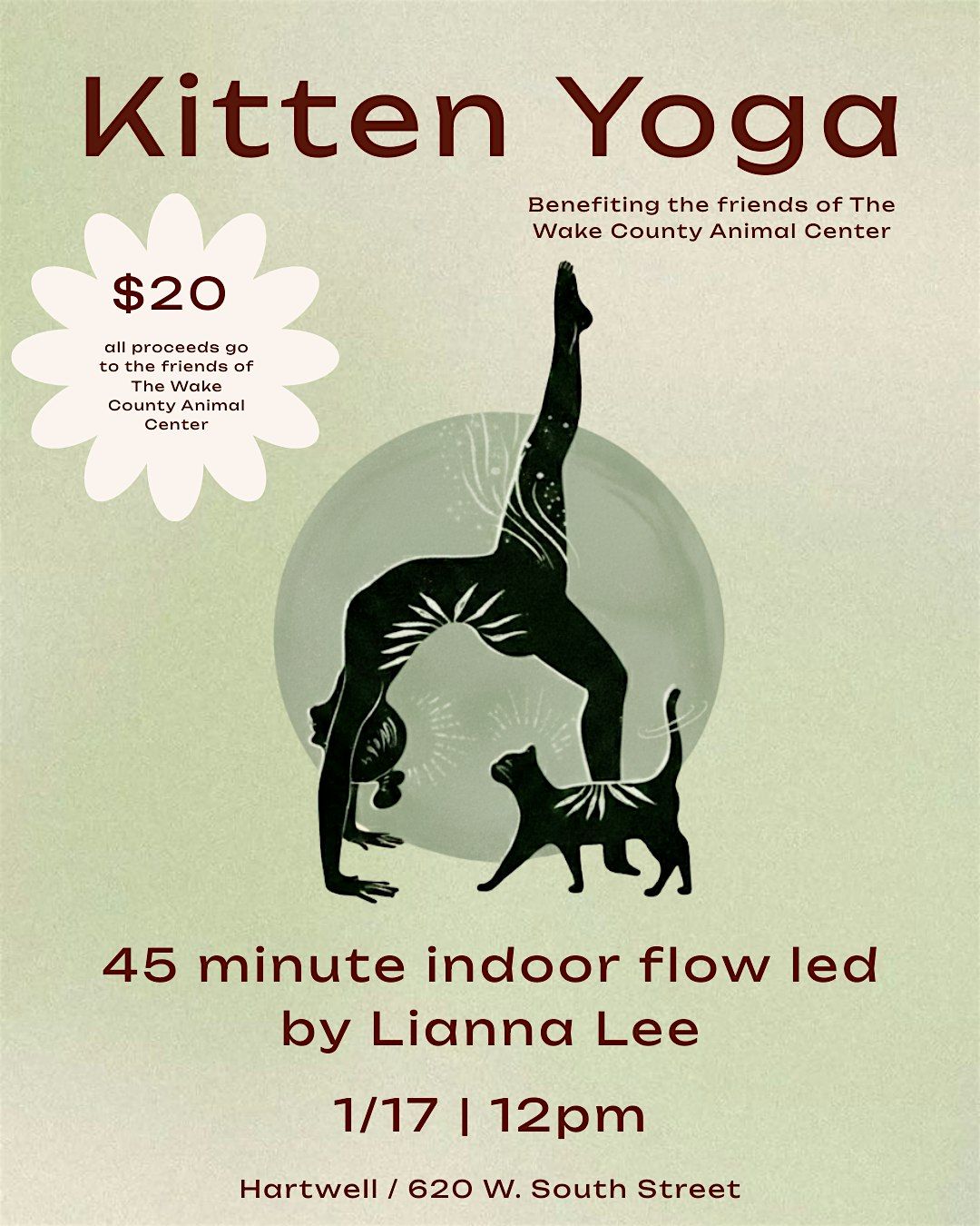 ALL PROCEEDS FROM THIS EVENT GO DIRECTLY TO THE FWCAC! Come join us for a purrfectly relaxing yoga session with adorable kittens! This in-person event will be held at Hartwell on West South Street in Raleigh, NC, USA. This 45 minute flow is led by Lianna Lee. Get ready to stretch, destress, and cuddle up with some furry friends. All proceeds will go towards supporting the Friends Of The Wake County Animal Shelter. Don't miss out on this meowvelous opportunity to do yoga surrounded by kittens! Please bring your own yoga mat and water bottle.