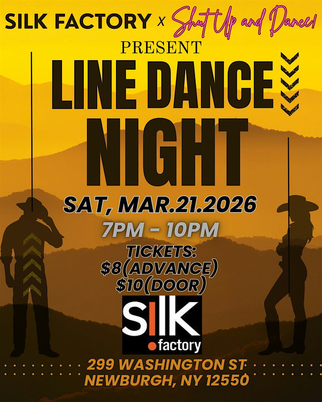 Get ready to hit the floor and show off your moves at our Line Dance Night! Join us in person at the Silk Factory for a fun-filled evening of great tunes, lively beats, and awesome company. Whether you’re a seasoned dancer or just looking to try something new, this night’s for you. Bring your friends, grab your boots, and let’s dance the night away!