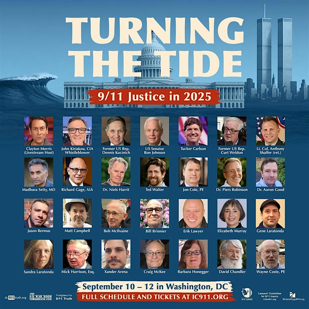 Turning the Tide 2025 is proudly hosted by DC 9/11 Truth, The 9/11 WarRoom, Firefighters for 9/11 Truth, the International Center for 9/11 Justice, the Lawyers' Committee for 9/11 Inquiry, and RichardGage911.