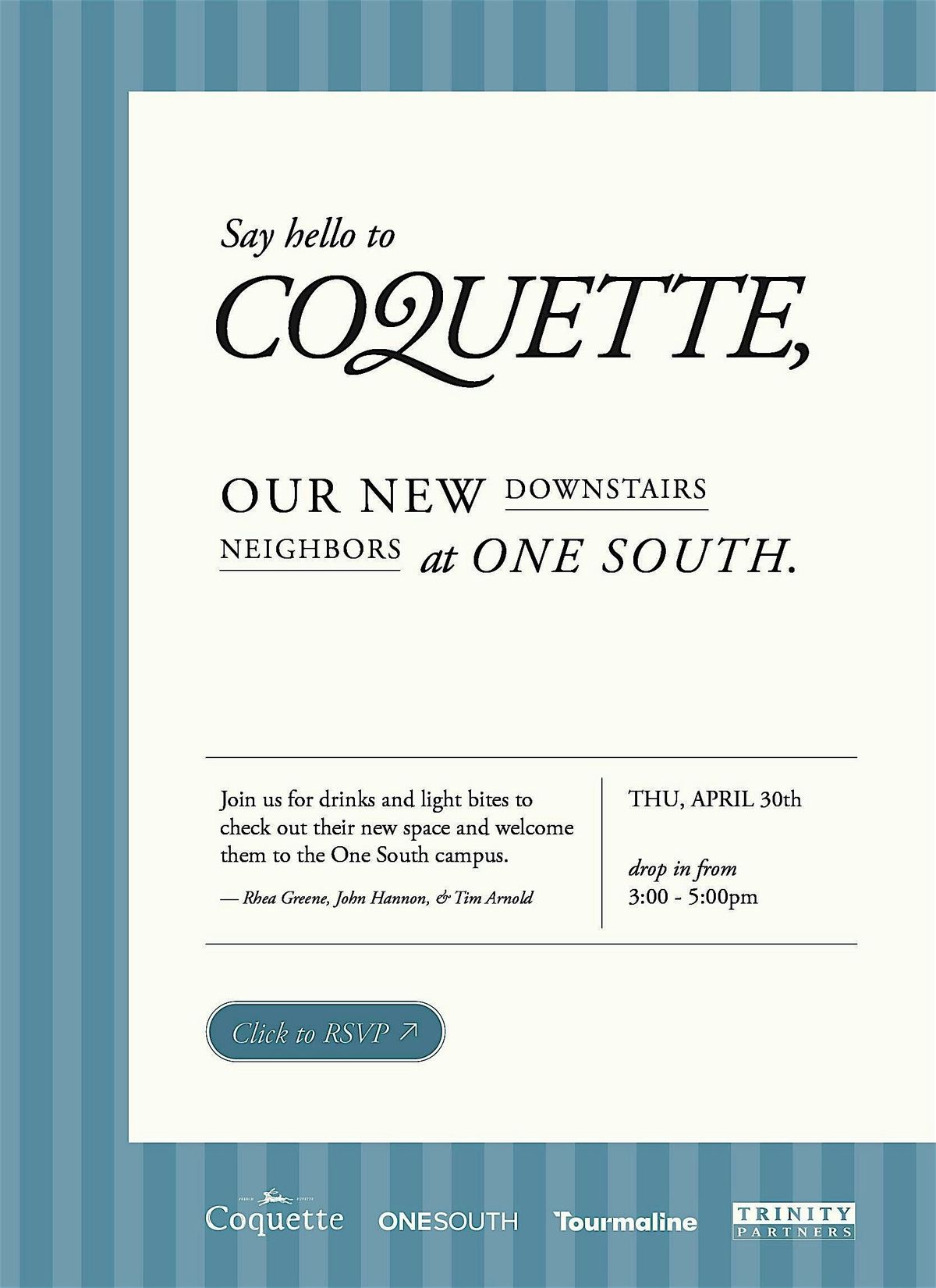 Join us for drinks and light bites to check out Coquette's new space and welcome them to the One South campus.About this Event