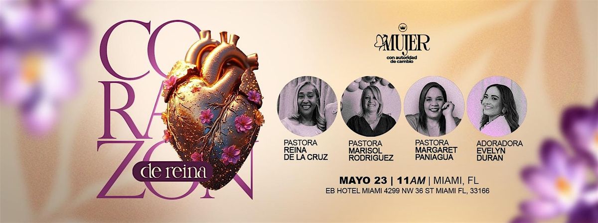 ¡Prepárate para vivir una experiencia única y llena de pasión en nuestro evento ,Corazon De Reina! Ven a disfrutar de una atmósfera gloriosa, rodeado de adoracion y alabanza. No te lo puedes perder, será una ocasión para sanar el corazon, conectarte con Dios y mujeres de reino. ¡Te esperamos con los brazos abiertos!