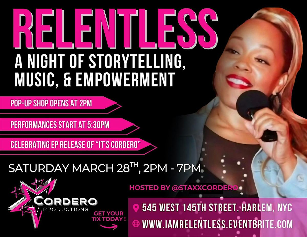 We are so excited to bring you NYC's finest entrepreneurs specializing in food, desserts, jewelry, hair, skincare and more. Topping it off with live performances with featured monologues from the one woman show, I Am Relentless and the celebration of Staxx Cordero's EP "It's Cordero!"