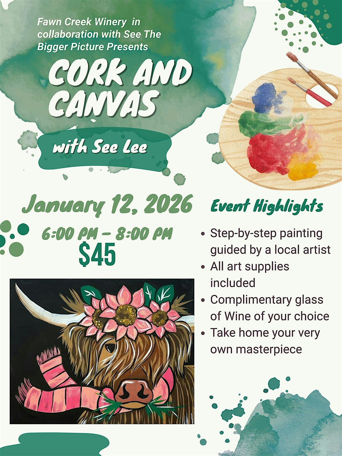 Join us for a fun evening of painting and sipping wine at CORK AND CANVAS-Spring Highlander Cow! Painting-step by step guidance, pre-traced