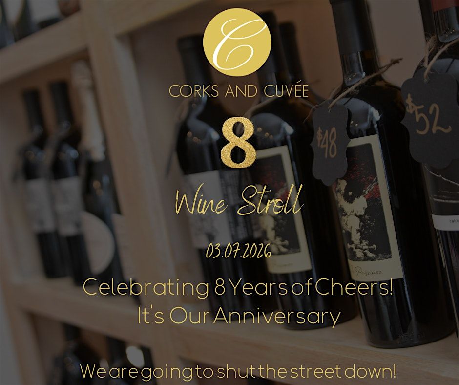 Get ready to raise your glass and celebrate 8 amazing years of wine, friends, and fun! Join us in person for the Corks and Cuvee Anniversary Wine Stroll, where you’ll sip, stroll, and savor some fantastic wines. It’s the perfect way to toast to good times and great company. Don’t miss out on this cheers-worthy celebration—come thirsty and ready to mingle!