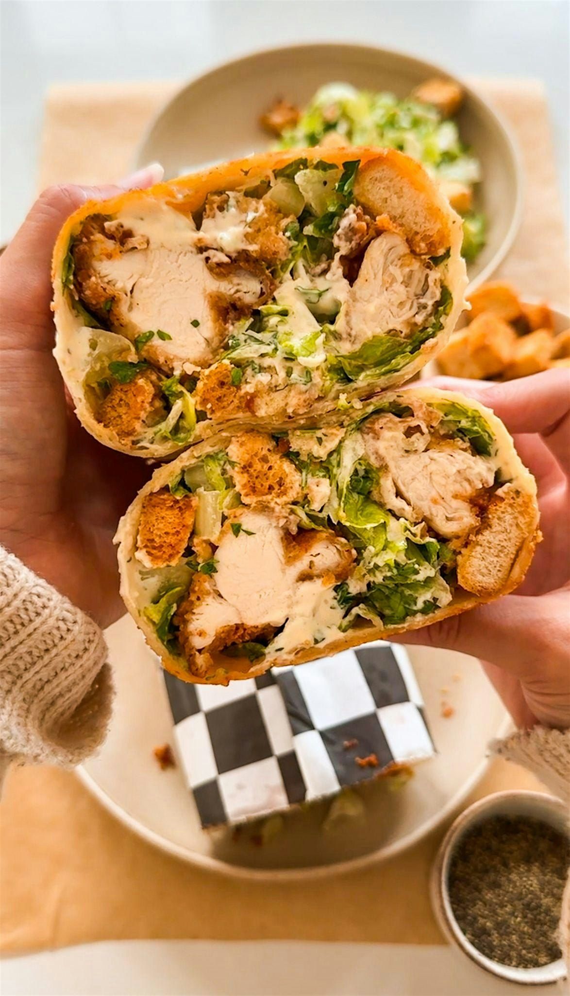 Crispity Crunchity Chicken Caesar Wrap Super crispy chicken cutlet | Shaved romaine + kale | Parmesan–black pepper Caesar | Pickled red onion + Roasted tomato jam | Garlic-butter breadcrumb crunch | Lemon | Parmesan shards | Warm scratch tortilla