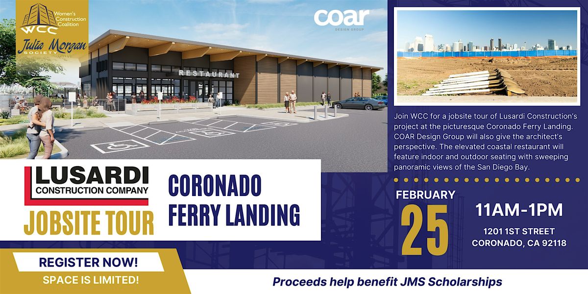 Join WCC for a jobsite tour of Lusardi Construction’s project at the picturesque Coronado Ferry Landing. COAR Design Group will also give the architect’s perspective. The elevated coastal restaurant will feature indoor and outdoor seating with sweeping panoramic views of the San Diego Bay.