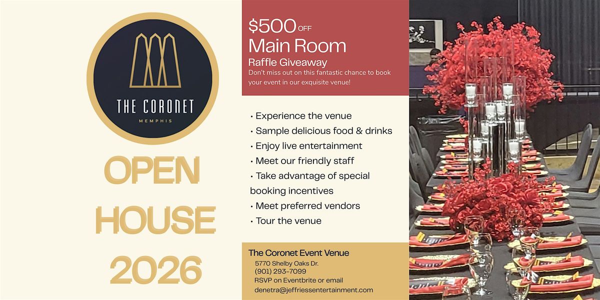 Step inside The Coronet and experience what’s possible. Join us for an immersive open house featuring fully styled mock event setups—from weddings and corporate meetings to baby showers and cocktail parties. Guests will enjoy live entertainment, tastings, photo opportunities, and interactive experiences from some of the region’s top event professionals. Whether you’re planning an upcoming celebration or looking to partner as a vendor, this is an event you don’t want to miss.