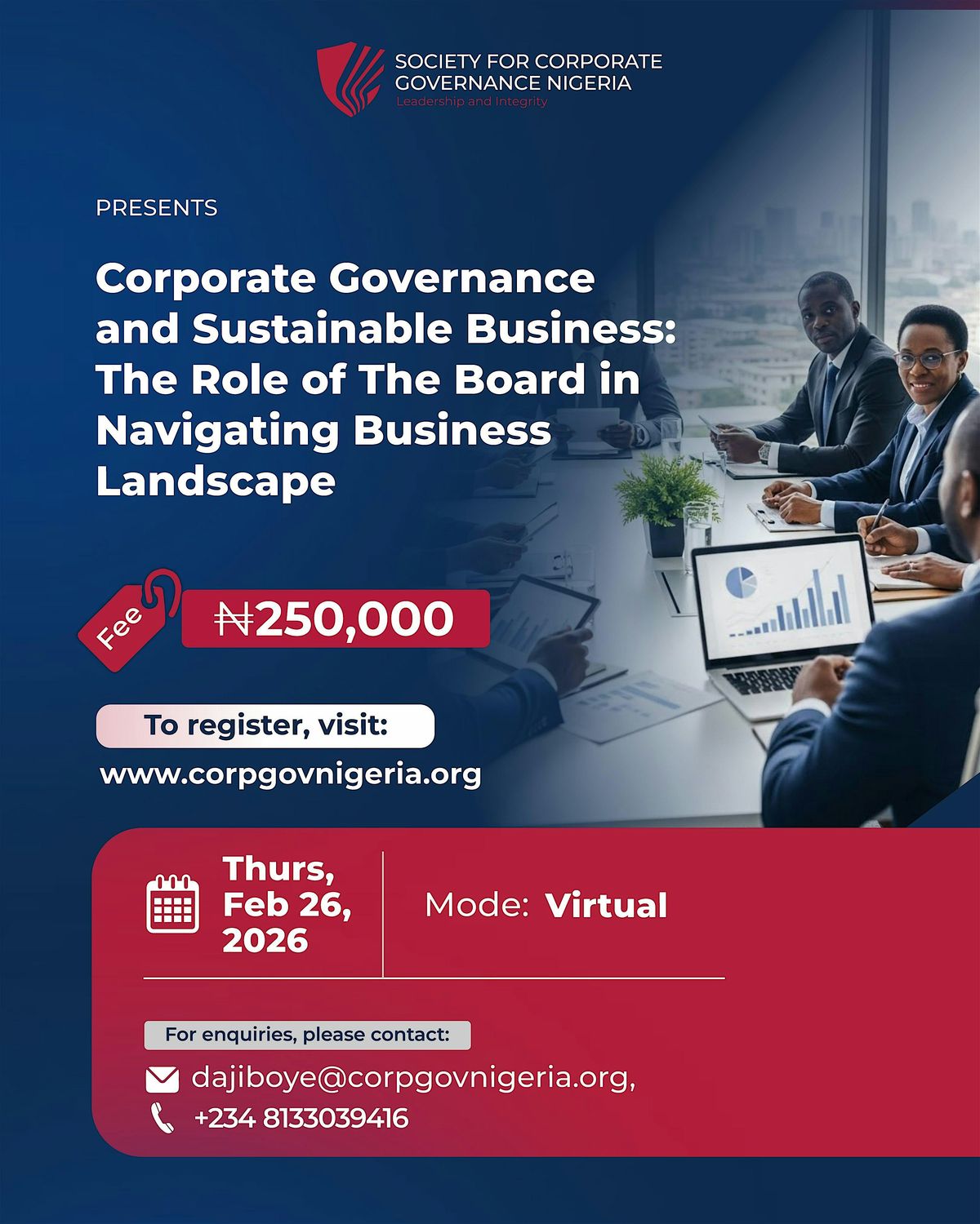 The Society for Corporate Governance Nigeria (SCGN) is pleased to present “Governance Leadership for Resilient and Sustainable Boards,” its first flagship Directors’ Training Programme for 2026. This executive-level programme is designed to equip board members and senior executives with practical, boardroom-ready governance insights to navigate today’s uncertainties and lead with confidence.