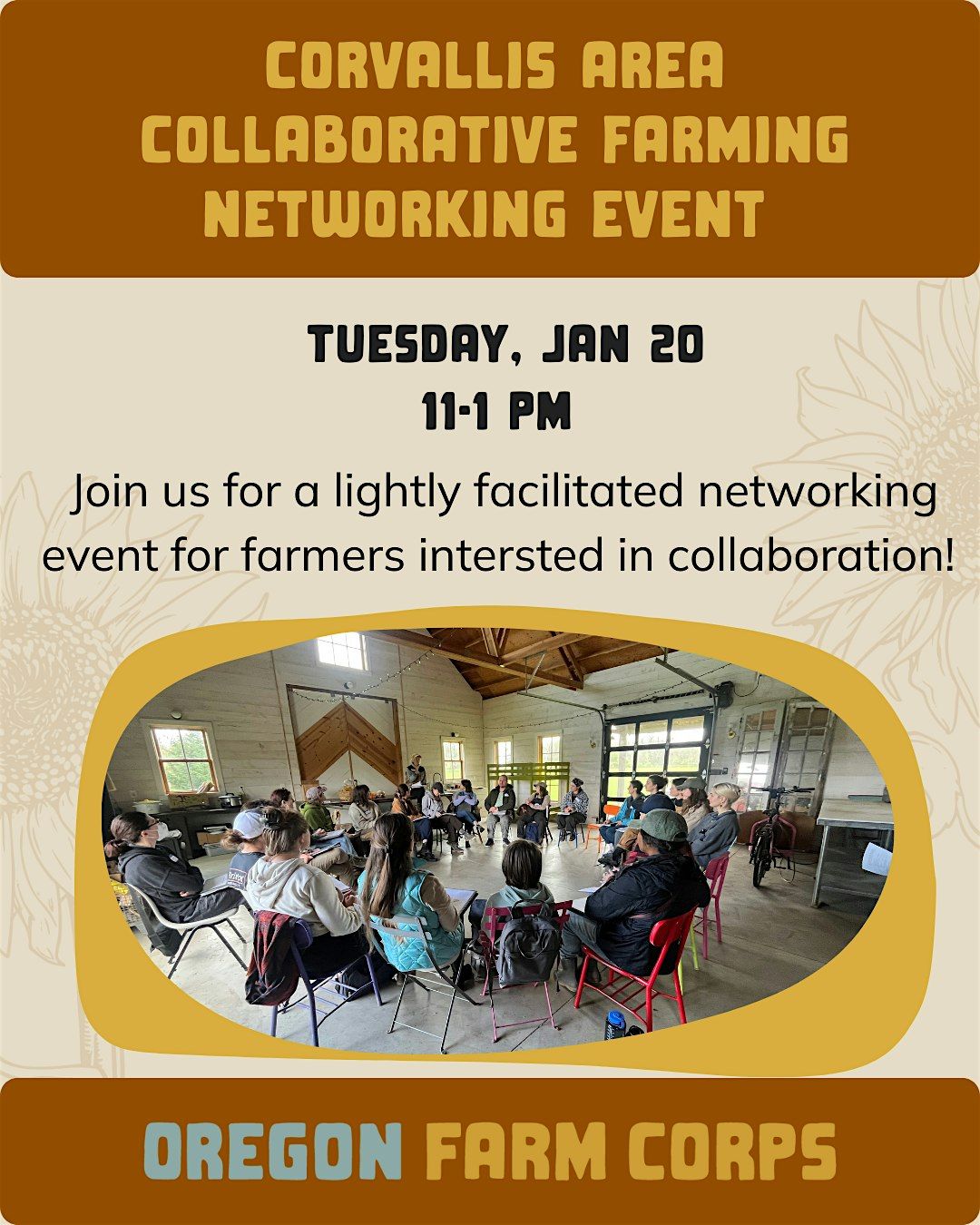 Join Oregon Farm Corps for a morning of lightly facilitated networking and community connection! This event will be an opportunity for collaboratively-minded farmers to connect, share ideas, and find potential collaborators.