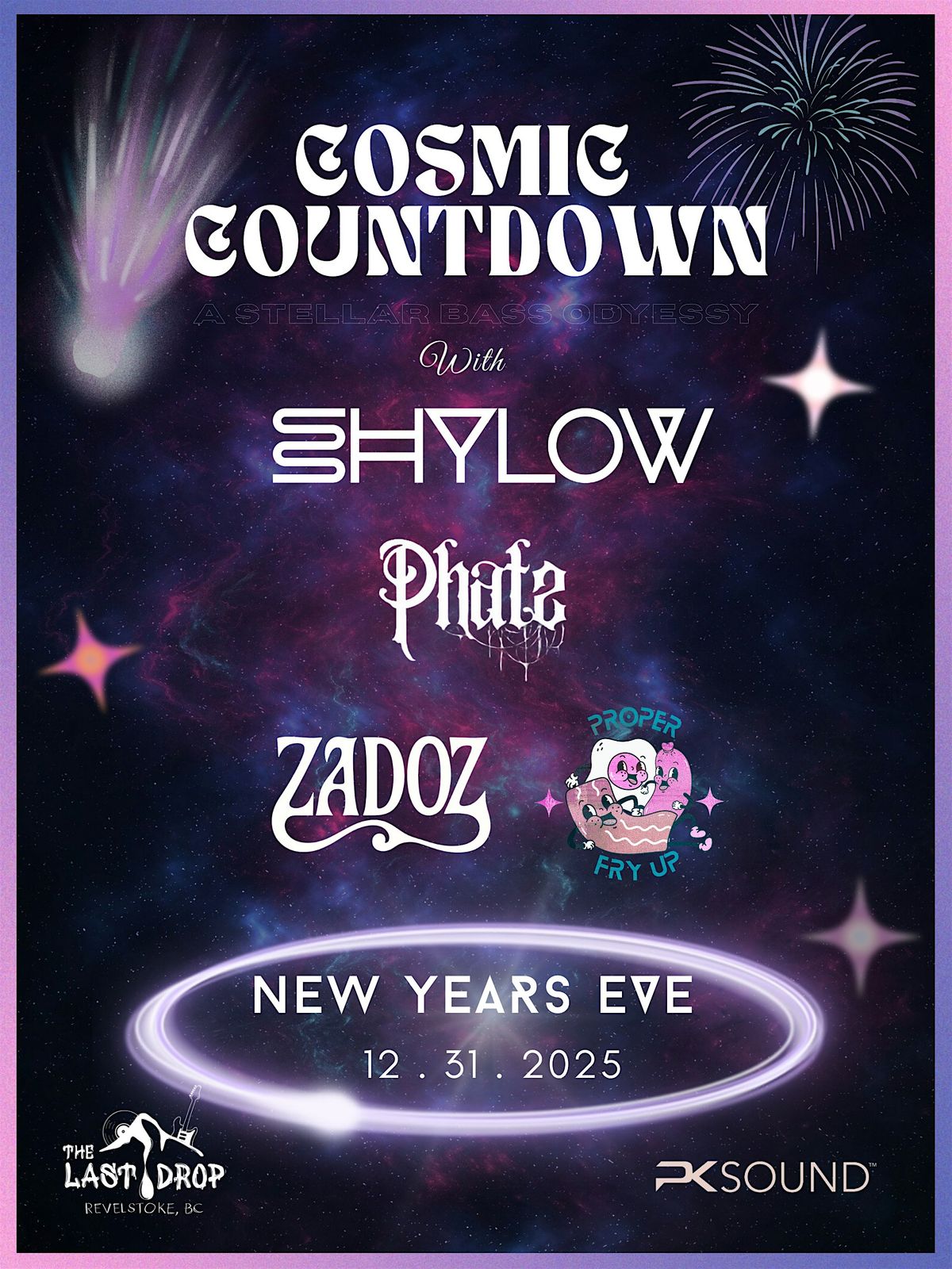 For this year’s New Years Eve Celebration we have the first Cosmic Countdown, where SHYLOW, PHATS, PROPER FRY UP, and ZADOZ unite to craft a multidimensional night of bass, rhythm, and high-vibration energy. Each artist brings their own signature sound—from cosmic bass journeys and deep underground sounds to groove-heavy party starters—working together to create an unforgettable stellar bass odyssey, for this Cosmic New Year’s Eve experience. Step into 2026 with a lineup built to lift the room and expand the mind 🧞♀️🍾🎆”