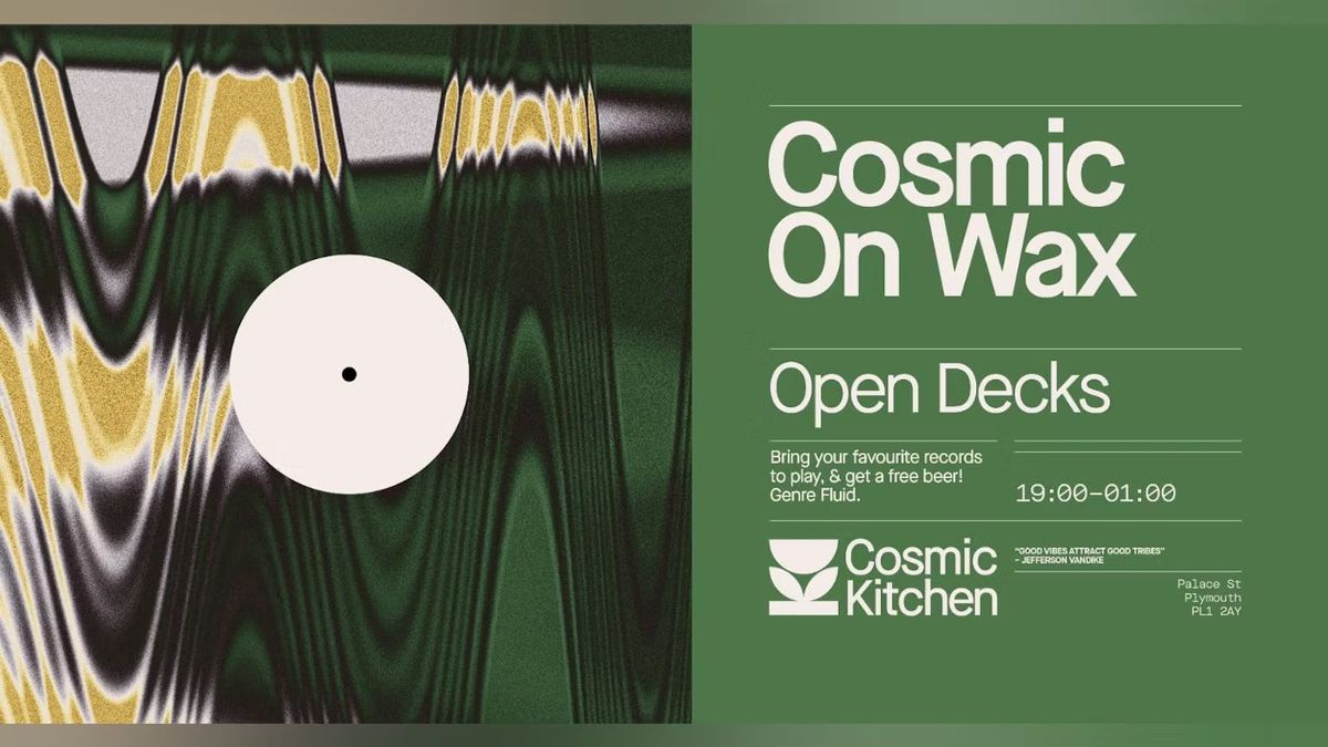 🌞Cosmic On Wax returns Friday for all YOU crate diggers, DJ's + record collectors with the new addition of selectors who play in digital format being able to now spin some tunes!This is our OPEN DECK NIGHT night which gives you all the chance to spin some of your well-loved records and music and showcase your collection to like minded peeps. COSMIC ON WAX is an OPEN DECK situation, rock up, bring your wax /usb and give them a spin. (we have diners in until 20:30 so please be mindful of keeping the music funky, and suitable for a Cosmic dinner service)ALL GENRES WELCOME. This event starts at 19:00 if we have people bringing easy listening music for the first 2 hours whilst we have our dinner service and ends at 2am in the summer months it starts a little earlier in the courtyard and in the autumn/ winter we start inside over dinner service Play your MUSIC and get one free BEER* the running order will be decided on the night - if you bring harder genres please bear in mind you’ll be playing the later part of the night to ensure the music isn’t too hard from the start of the night (techno/jungle etc)