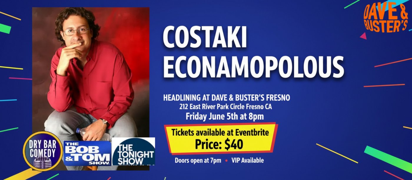 Get ready for a night of laughter with Costaki Economopoulos at Dave & Buster's Fresno! Join us on June 5, 2026 at 8:00 PM for a hilarious stand-up comedy show. It's going to be a night to remember, so grab your friends and come on down to Dave & Buster's Fresno for a great time!
