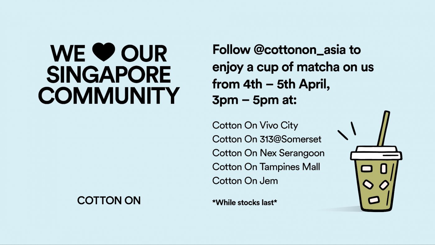 This weekend, Cotton On is spilling the real tea (well, matcha, actually) at five stores across Singapore. It's the brand's heartfelt thank you to the Singapore community that makes Cotton On part of their everyday style story.