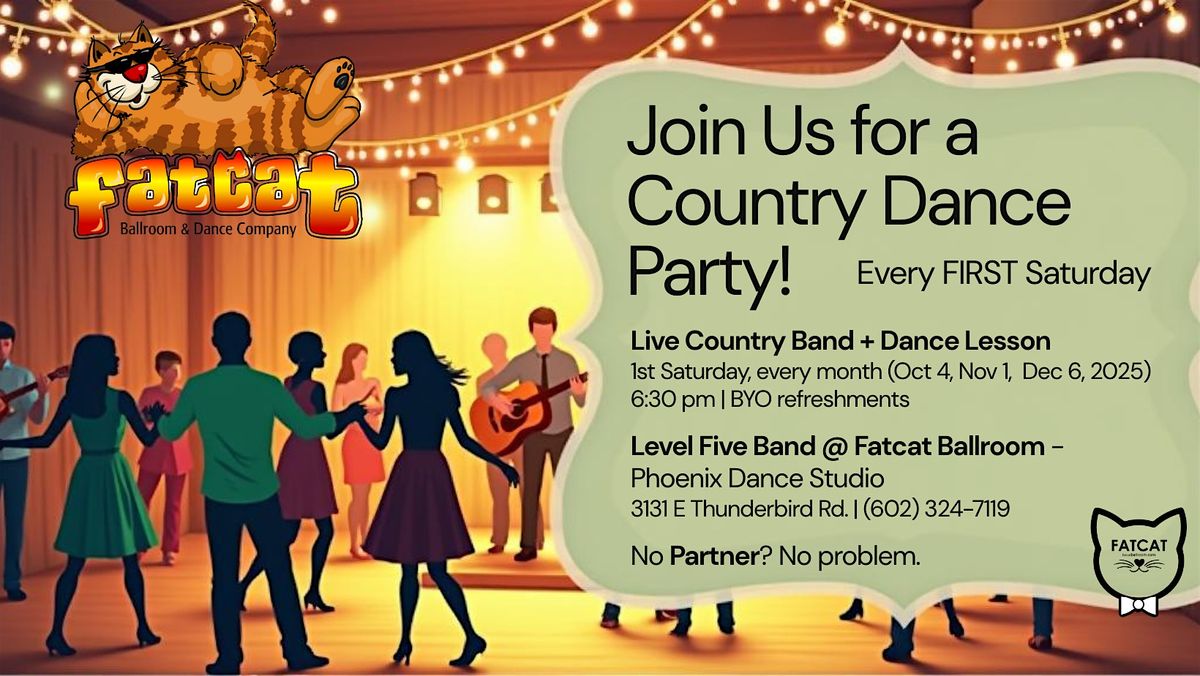 ๐ธ Live Music by Level Five Band + Beginner Country Dance Lesson | Saturday, October 4th | 6:30 PM โ Fatcat Ballroom, Phoenix