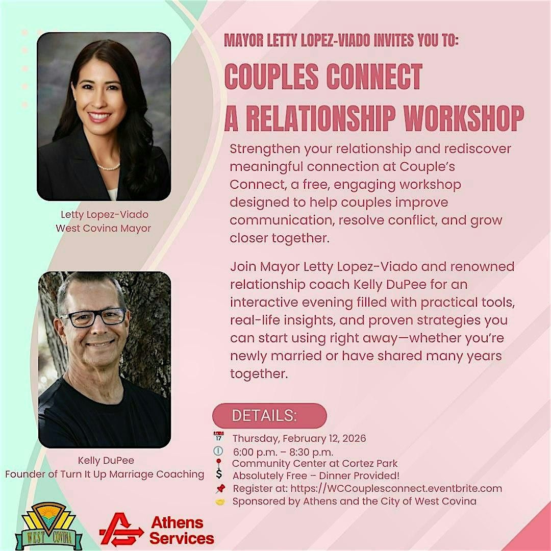 Welcome to COUPLES CONNECT - A RELATIONSHIP WORKSHOP! Join us at Cortez Park Community & Senior Center on February 12, 2026 at 6 PM for a fun and interactive workshop designed to strengthen your relationship. This event is perfect for couples looking to deepen their connection and communication skills. Don't miss out on this opportunity to grow together and create lasting memories. See you there!