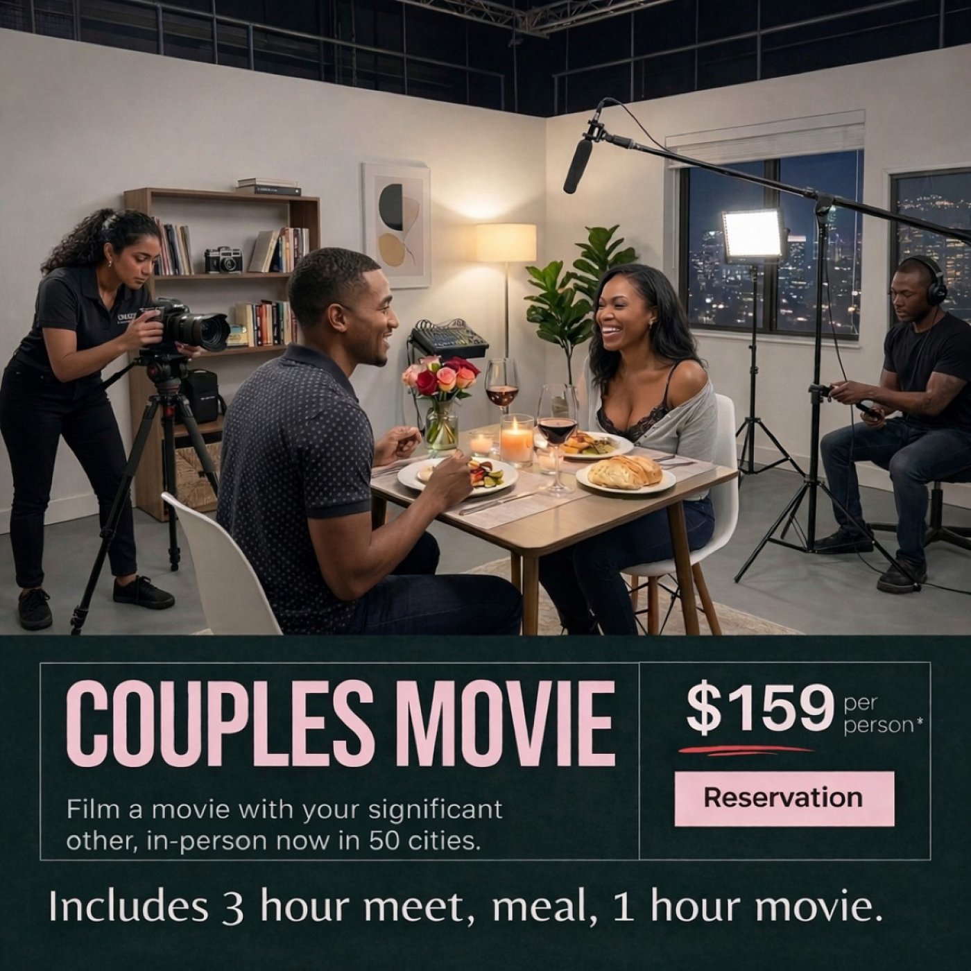 SMS Novel is proud to offer our new Romance Film Event for Couples. Every night at 8pm and 11pm, couples are invited to a unique personal film and dinner experience. Meet with two SMS hosts (one male and one female crew) to film a fun romance, comedy, drama, or bring your own idea. No acting experience or line memorization required. Receive your one hour film, edited, within 24 hours. Keep film as private keepsake for your eyes only or choose to share or sell it online. Only $159 per person.