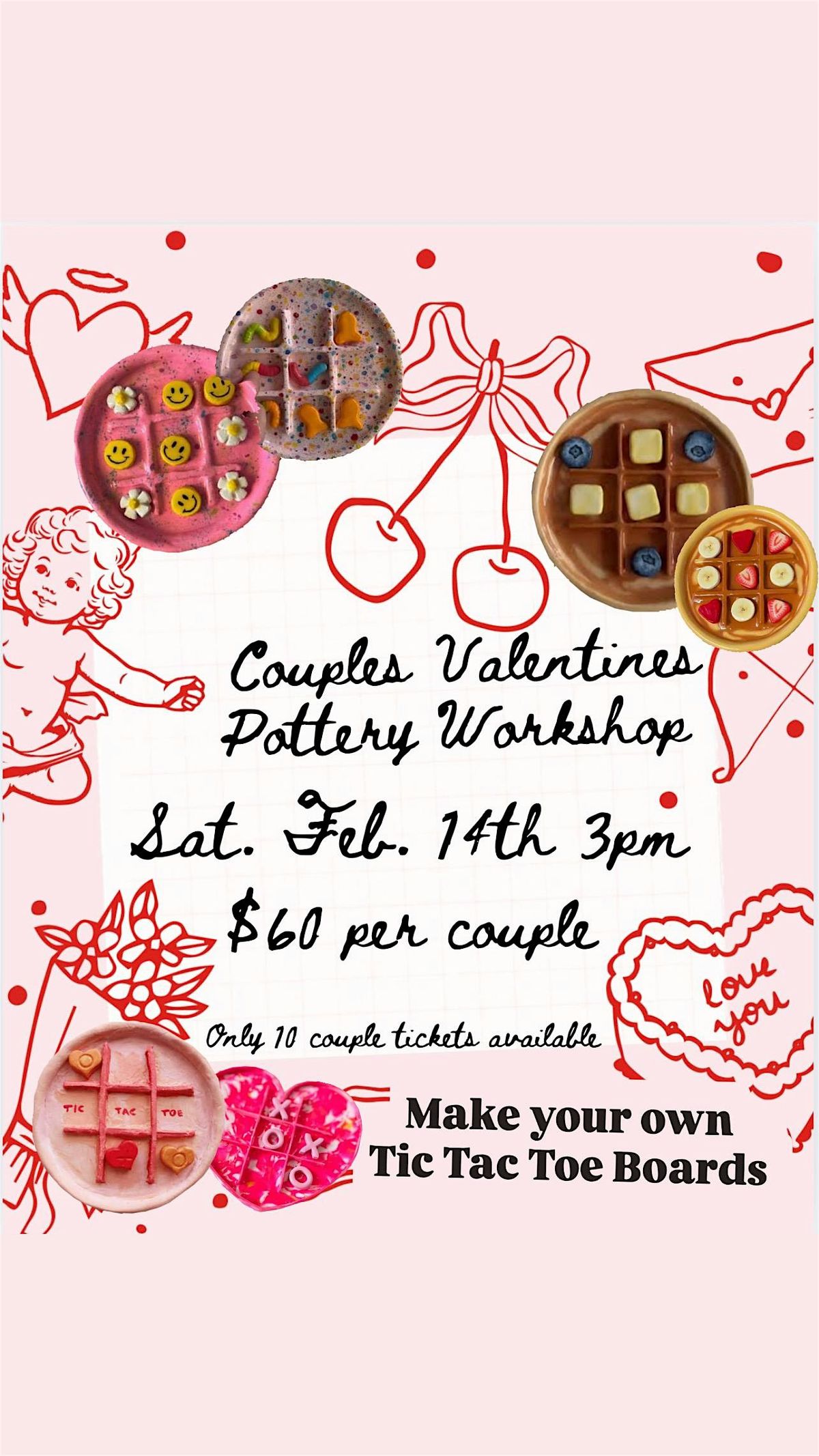 Grab your partner and come make a uniquely beautiful tic tac toe board in studio on Valentines Day. Each couple will make 1 board and all the game pieces. After making your pieces you will then pick the color glazes for them. You will pick up all completed pieces in 8 weeks time. No experience needed and we provide all the tools and supplies.