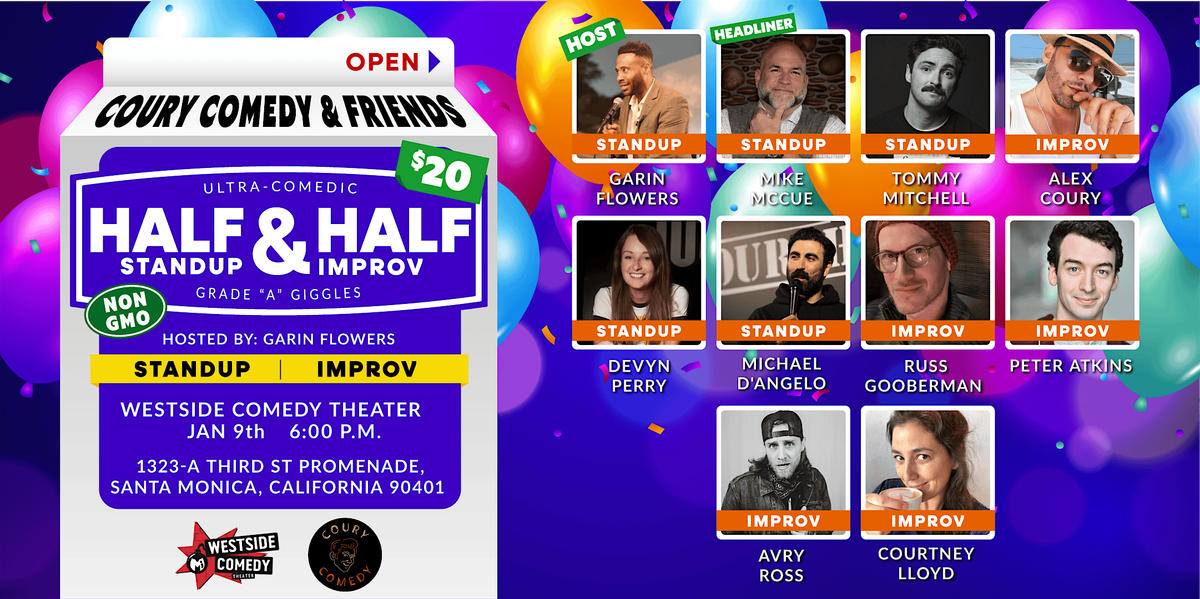 Join comedian Alex Coury and his dynamic group for the 'Coury Comedy and Friends, Half & Half show’ where stand-up comedy meets masterful characters in a unique improv experience. It’s one night, one stage, with a seamless blend of crafted jokes and on-the-spot character transformations. Anything can happen—and with improv as a centerpiece, it certainly will! What could possibly go wrong? Don’t miss out on a night that’s as thrilling as it is laugh-packed!