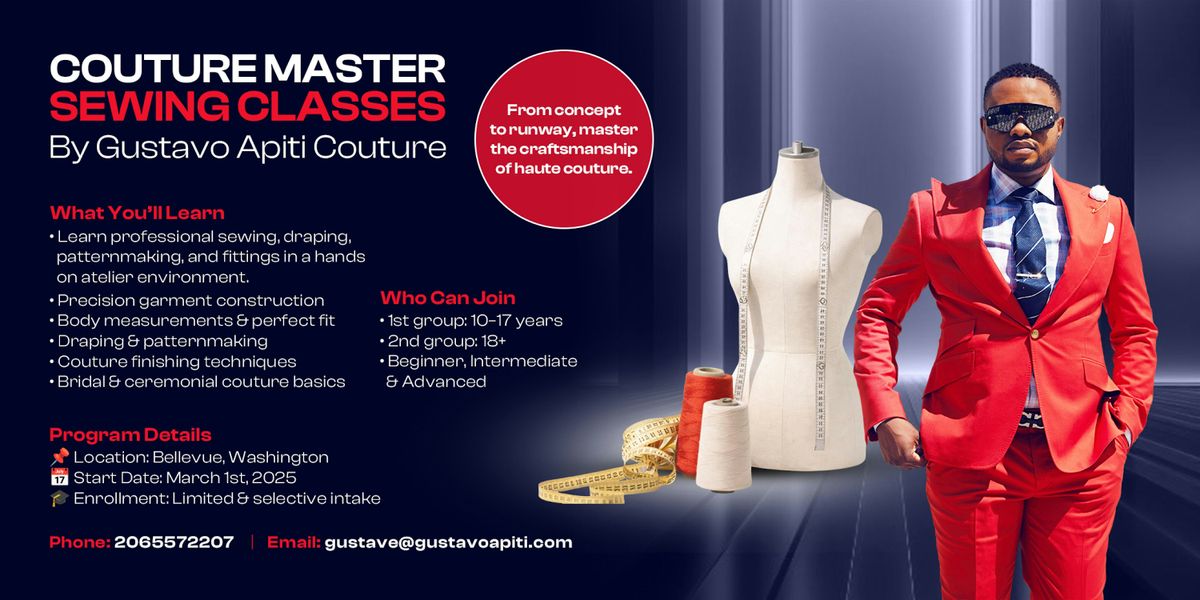 The Couture Master Sewing Classes are professional, hands-on training programs designed for youth and adults who are serious about learning couture-level sewing, garment construction, fit, and finishing in an authentic atelier-style environment.