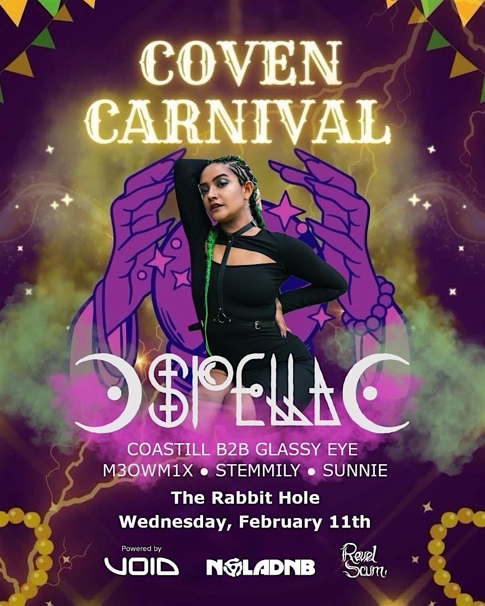 Headlined by Spella, the night dives deep with sets from Stemmily, M3owm1x, Coastill, Glassy Eye and Sunnie, pulling you from carnival chaos straight into the coven.