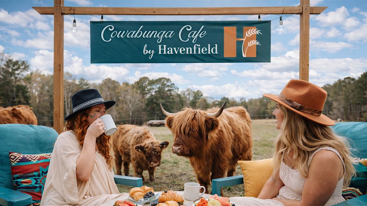Cowabunga Café is a Saturday farm gathering designed for connection — to nature, to animals, and to each other. Guests enjoy coffee service in the open pasture while gentle Highland cows, sheep, and goats roam nearby. It’s peaceful, playful, and completely unplugged.